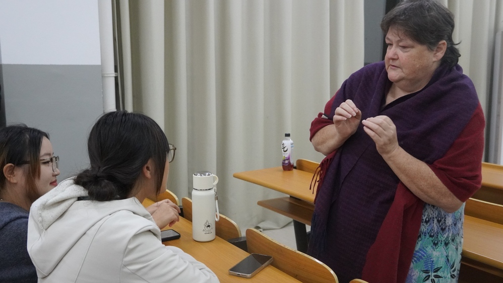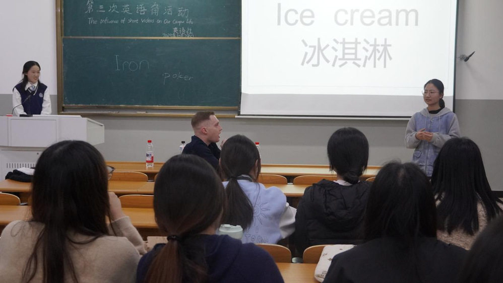 活动在主持人简洁流畅的英文开场中拉开序幕。三位老师随后登台,以各具特色的方式与同学们互动。Julie老师以自身经历切入主题,开玩笑道:“I spent three hours on Douyin last night, and I don’t even regret it!”(我昨晚在抖音上刷了三个小时,但我一点也不后悔!),这句真诚又幽默的自白瞬间引发了全场共鸣,掌声与笑声齐飞,迅速点燃了现场气氛。
