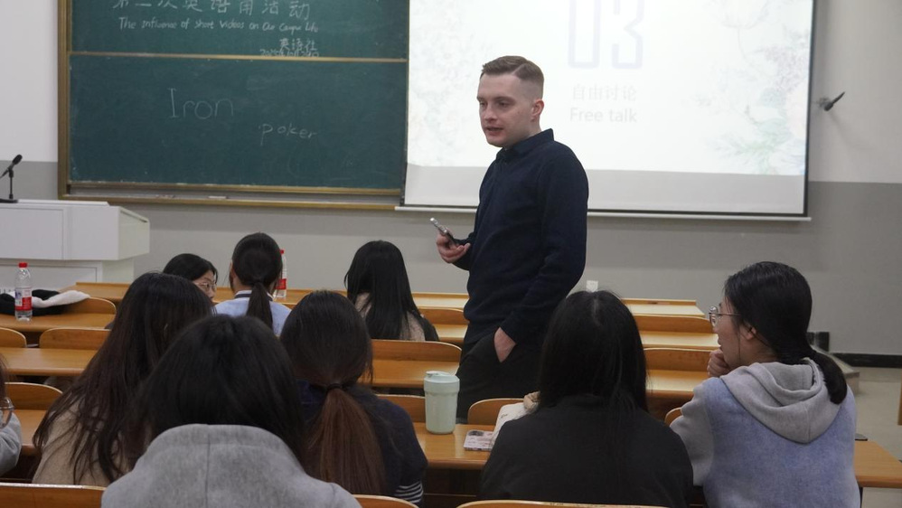 意犹未尽的游戏环节过后,活动随即转入“自由讨论”环节。同学们分为三个小组,在三位老师的引导下,围绕主题展开深度交流。老师们不时抛出启发式问题,其中Julie老师提出的“Is short-video a study aid or a time killer?”(短视频究竟是学习的帮手,还是时间的‘杀手’?),引发了同学们的认真思考与多元观点的碰撞。讨论过程中,大家结合自身经历畅所欲言:有同学分享通过短视频学习英语口语和专业知识的高效与乐趣,也有同学坦言曾沉迷刷剧而熬夜,影响了次日学习。小组讨论结束后,各组代表依次上台,用流利的英语梳理了小组的核心观点,既有批判性思考,也不乏建设性建议。Calum老师随后登台,分享了关于“如何平衡网络娱乐与学习生活”的实用心得。他形象地建议:“尝试为短视频设置使用时限,就像给生活设一个闹钟”。