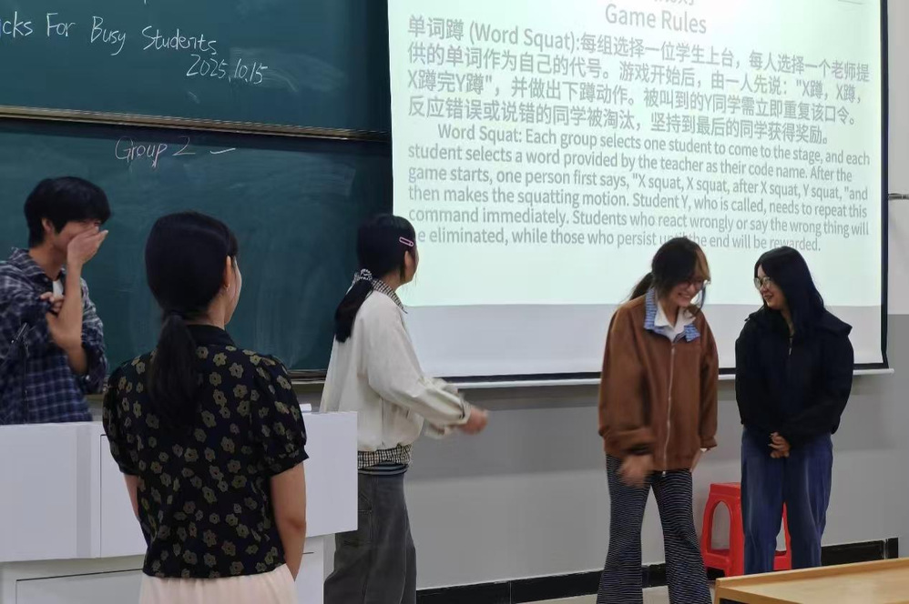 讨论意犹未尽,新一轮游戏“单词萝卜蹲”又将气氛推向高潮。参赛同学各自认领一个英文单词作为代号,在快速口令中蹲起、点名,不仅考验词汇记忆,更挑战反应速度。过程中,有人一时忘记“身份”,愣在原地;有人误喊他人代号,引发阵阵欢笑。这场体力与脑力的双重比拼,不仅活跃了气氛,更在默契协作中增进了友谊。